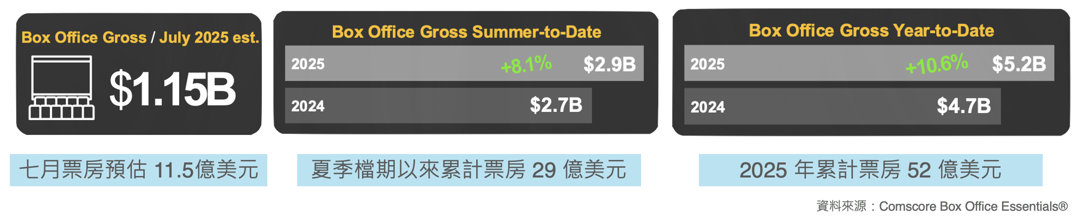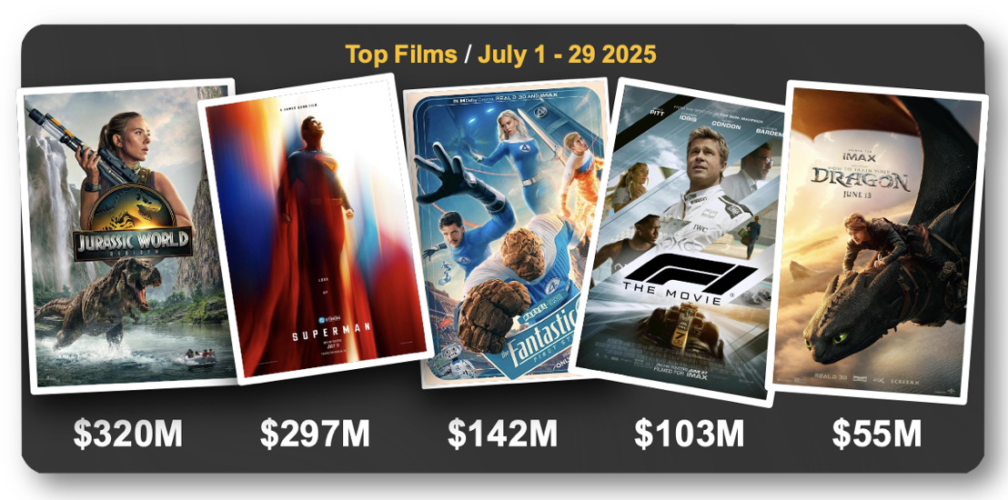 2025 年 7 月簡直就是超級英雄 (還有恐龍) 稱霸的月份!Comscore 美國票房統計數字,《驚奇4超人:第一步》以及深受粉絲喜愛的《超人》和《侏儸紀世界:重生》在七月最後一個週末奪得前三名;DC 的《超人》和漫威的《驚奇4超人:第一步》,都在上映兩周內票房都超過 1 億美元。六月就上映的《 F1 電影》和《馴龍高手》也在七月取得佳績,合計為當月增加了 1.58 億美元的收益。