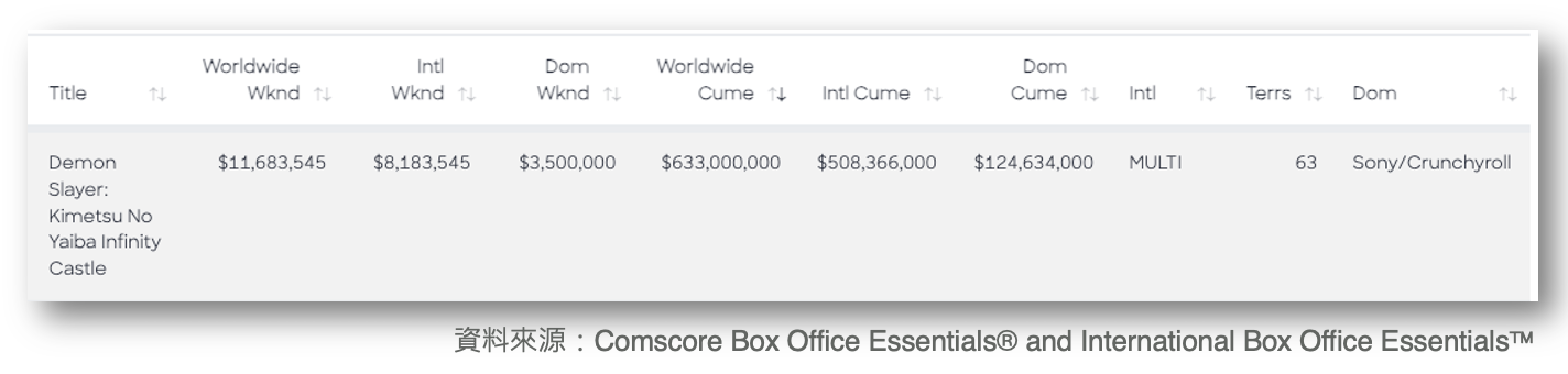 觀察美國 10 月第一週票房表現,我們看到《鬼滅之刃無限城篇》自 9 月上映以來,全美票房 已經累積到 1.25 億美元。Comscore Movie 資深媒體分析師 Paul Dergarabedian 在 CNN 報導中表示,《鬼》在北美的熱賣完全是意料之外的驚喜,根據 Comscore Movie 數據顯示,這是美國歷來在 9 月上映的電影中,首週票房第六高的電影。鬼滅之刃在全球的熱映,也顯示了日本動漫在 K-POP 席捲全球的世代中,還是有著不可撼動的地位。