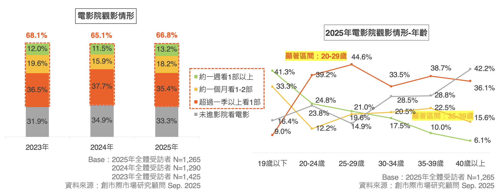 進一步分析顯示,「每週觀影 1 部以上」的主要族群集中於 24 歲以下;而「每月觀看 1–2 部」則以 25–29 歲族群最為顯著。