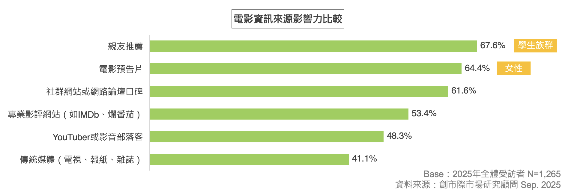 調查結果顯示,民眾在取得電影資訊時最受影響的來源來自「親友推薦」(67.6%)與電影預告片(64.4%),其中學生族群特別依賴親友建議,而女性觀眾則更容易受到預告片吸引。除此之外,「社群網站與論壇口碑」(61.6%)也扮演重要角色,持續影響觀影決策。