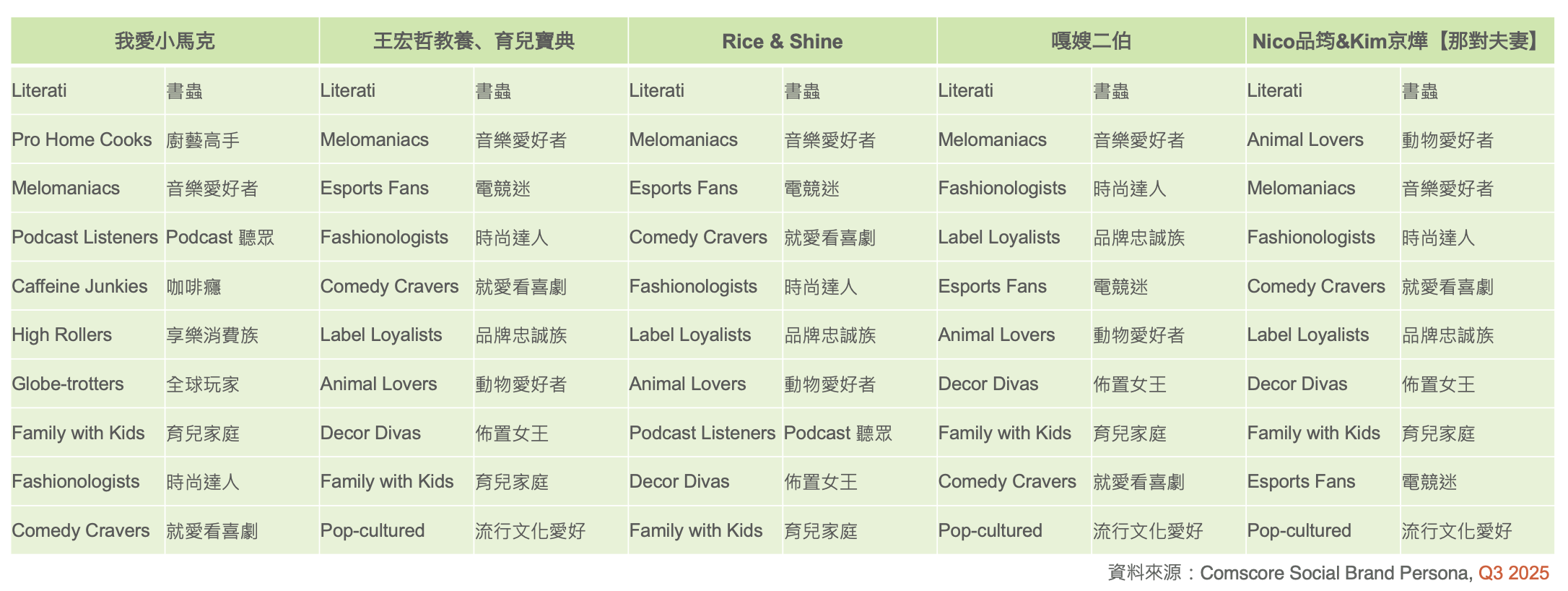 五組網紅共通的社群網友類型為「書蟲」、「音樂愛好者」、「育兒家庭」、「就愛看喜劇」,反映出親子、教育、家庭感是此類網紅社群的核心需求。但觀察差異則發現: