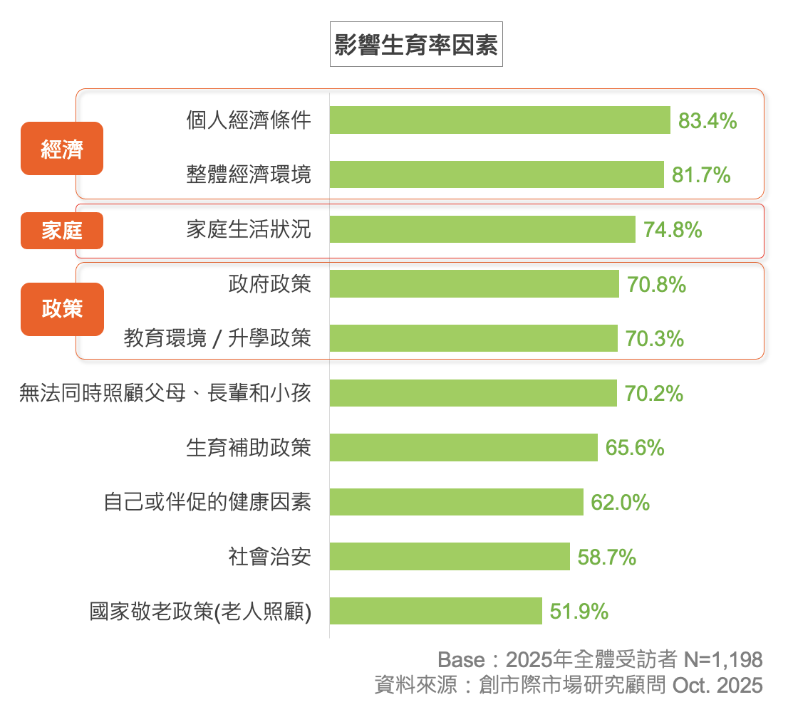 由調查發現:民眾認知影響生育率的原因,以經濟層面佔比最大;「個人經濟條件」(83.4%)、「整體經濟環境」(81.7%),明確反映了經濟壓力是民眾決定生育時的首要考量。