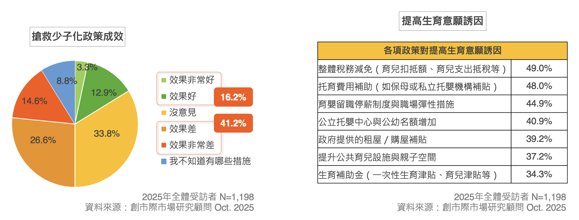 政策方面,民眾對「搶救少子化政策成效」的負面評價(偏向效果差:41.2%)遠高於正面評價(偏向效果好:16.2%)。在實質政策期待方面,民眾對於提高生育意願最大的誘因集中在減輕長期財政負擔,以「整體稅務減免」(49.0%) 和「托育費用補助」(48.0%)位居首重,遠高於一次性的「生育補助金」(34.3%)。
