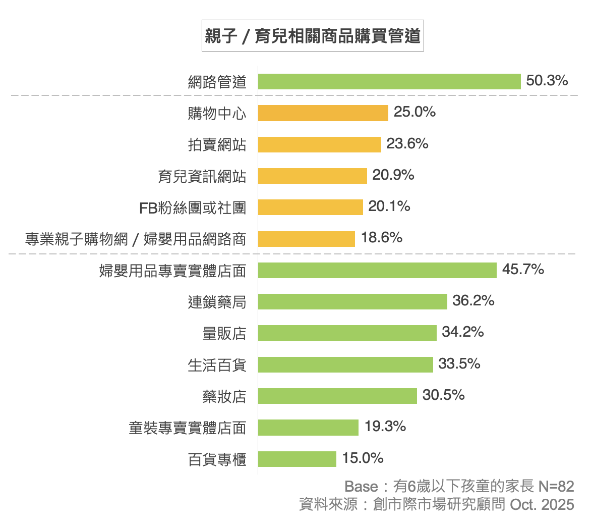 調查六歲以下孩童的家長,其購買親子/育兒商品的管道,以「網路管道」(50.3%) 的使用率為首要採購渠道。其中,「購物中心」(25.0%) 與「拍賣網站」(23.6%) 構成網路兩大主要流量入口。
