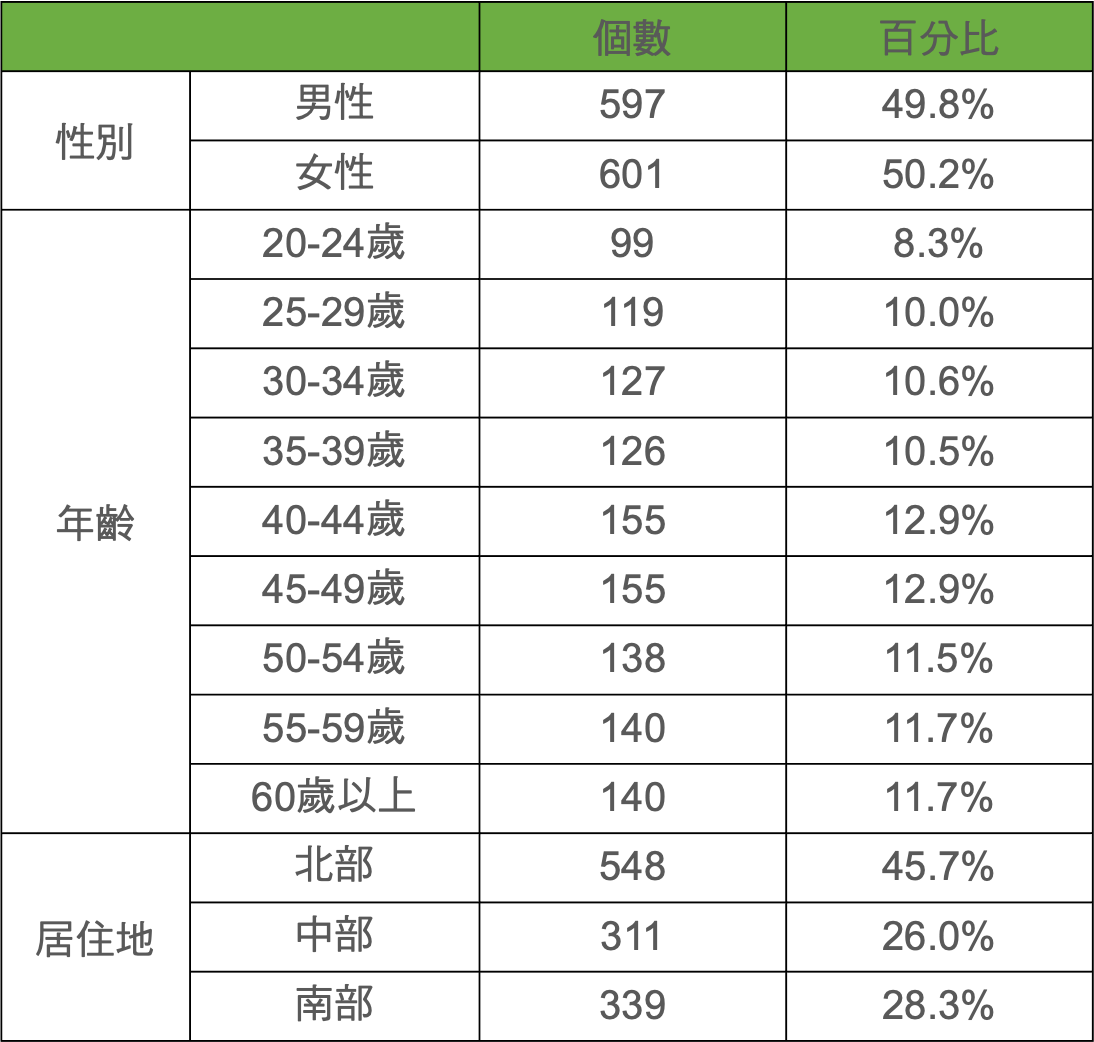 為深入剖析當前國人的生育意願變化趨勢,評估政府各項少子化政策在民眾認知與實際效益上的落差,並同時了解育兒家庭在商品購買通路上的最新偏好,創市際於 2025 年 10 月 9 日至 21 日,針對 20 歲以上的網友進行「親子篇」的調查,總計回收了 1,198 份問卷。