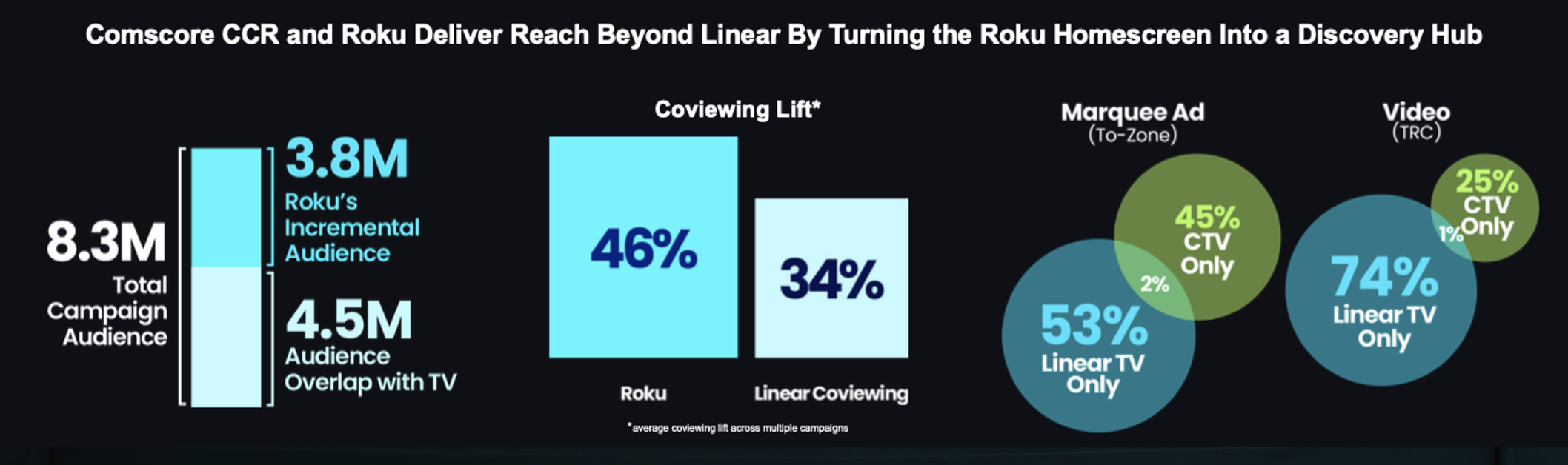 為了顯示新平台的聚眾效應,Roku 透過 Comscore CCR 做了幾波內容監測,監測結果總共觸及 830 萬人,但如果內容只在傳統電視上播出,將會損失在 Roku 上的 380 萬人(可能是剪線族、純數位族)。而在 Roku 上的共同觀看 (Coviewing) 比例也較高,共同觀看可視為多重眼球數,同一次的內容曝光可能觸及到更多人。最後,在不同的廣告形式上,我們可以看到 CTV 跟 Linea TV 的重疊非常小,顯示兩種平台其實是「各有各的擁護者」,因此跨平台帶來的是實際上的增益效果,而非單純只是累積接觸頻率。