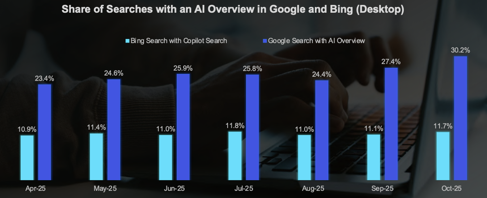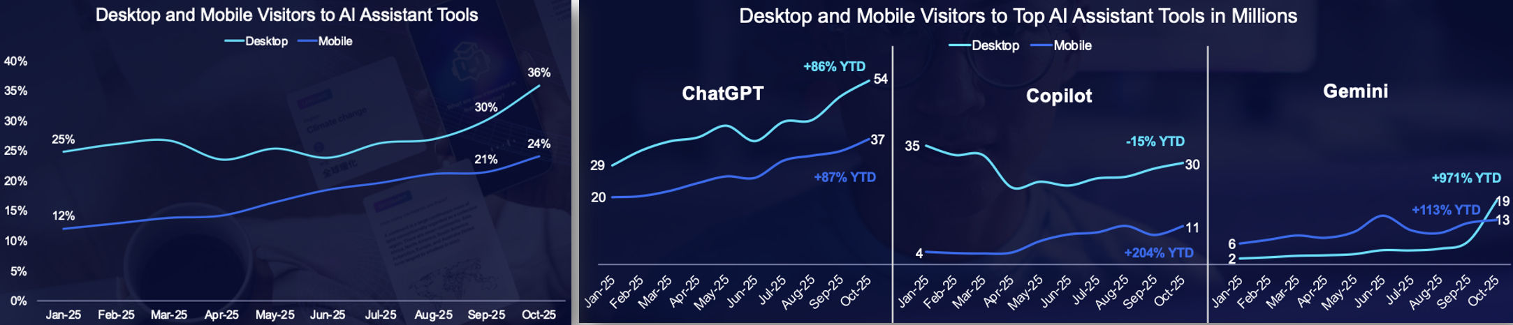 AI 助理工具在美國的採用率,桌機來到 36%,行動裝置也有 24%。而 ChatGPT 仍舊是最廣泛被運用的 AI 助理工具,而 2025 年第三季推出的 ChatGPT 5,一舉將桌機使用者推上 5,400 萬人,行動裝置也有 3,700 萬用戶。微軟的 Copilot 則是因為與 Windows 11 作業系統的整合,加上 2025 年 10 月的 Copilot Studio 功能更新,在桌機與行動裝置的使用人數上都見提升。