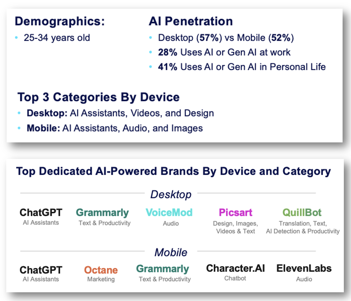 • Desktop:ChatGPT、Grammarly、VoiceMod、Picsart、QuillBot    • Mobile:ChatGPT、Octane、Grammarly、Character.AI、ElevenLabs