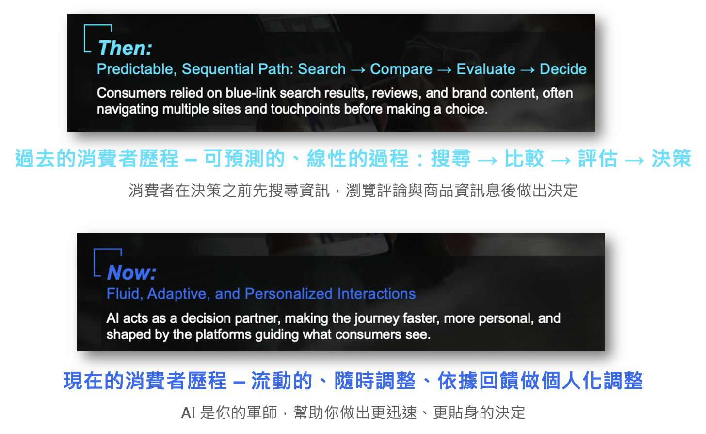 隨著 AI 助理的普及,民眾的消費者歷程也被重新形塑。過去的消費者歷程是個線性發展的過程,而在 AI 介入之後,消費者歷程變成一個動態變化的經驗。