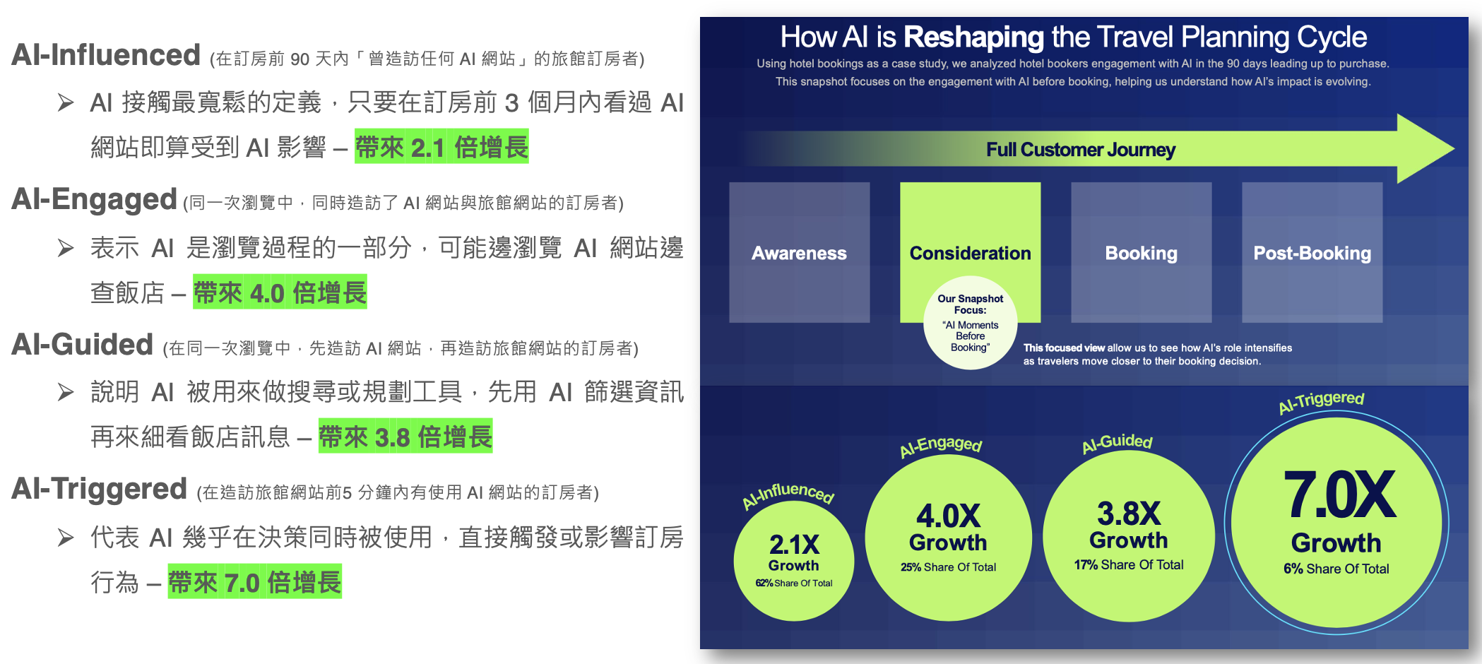 Comscore 觀察在 8 月某三日間,曾預定 11 個飯店集團任一房型的消費者,在預訂的 90 天前與 7 個 AI 網站互動的狀況,並且將 AI 驅動分為四個型態:AI-Influenced、AI-Engaged、AI-Guided、AI-Triggered。