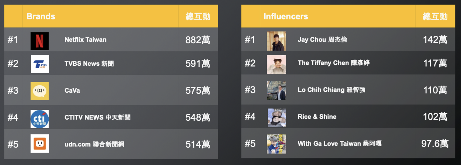 Comscore 觀察臺灣社群帳號在 2025 年 6 月發出的社群貼文,獲得最高總互動數的社群品牌前五名分別是 Netflix (TW)、TVBS 新聞、CaVa (東森噪咖)、中天新聞與聯合新聞網。Netflix 在 6 月時發布了許多社群貼文為現象級 IP《魷魚遊戲》宣傳,效益最佳的一則 TikTok 貼文獲得 160 萬次互動。