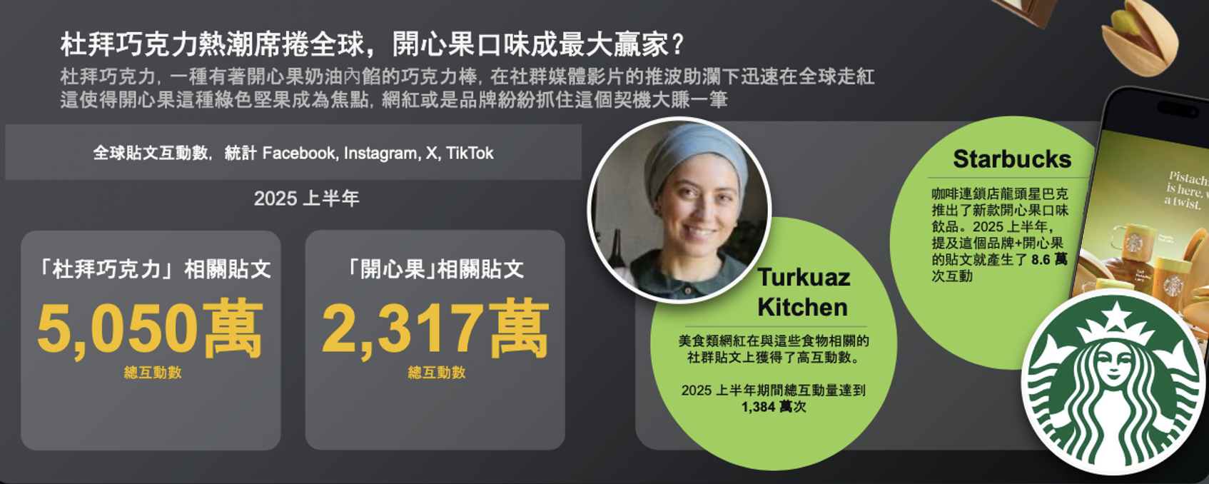 除了在臺灣無所不在的香菜口味外,另一項綠色食品 – 開心果也是本年度的熱門話題。然而,開心果口味的全球大流行,或許要回溯到在 2021 年爆紅的杜拜巧克力,這股熱潮延燒至今,Comscore Social 觀察 2025 上半年全球社群關鍵字數據,與杜拜巧克力相關社群貼文收得 5,050 萬次互動數,與開心果相關的社群貼文則獲得 2,317 萬次互動。連鎖咖啡品牌也搭上這波熱潮,推出開心果風味飲品。