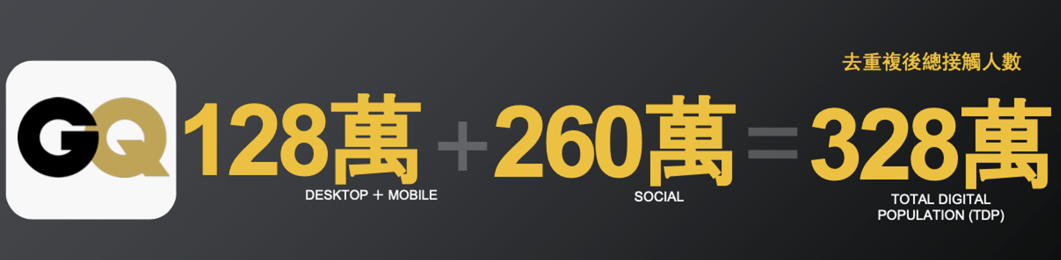 跨國媒體集團 Conde Nast (康泰納仕) 於 2025 年初與 Comscore 進行全球性合作,將旗下所有媒體品牌的社群數據連結到 Comscore 後台,進一步與其網站流量數據進行綜合計算。在 2025 年 6 月數據中,我們可以看到 GQ 臺灣在網站端可以溝通到 128 萬臺灣網友,在社群上則是可以和 260 萬臺灣網友互動,總計可與 328 萬臺灣網友溝通(扣除當中 60 萬人為網站 / 社群重疊人口)。
