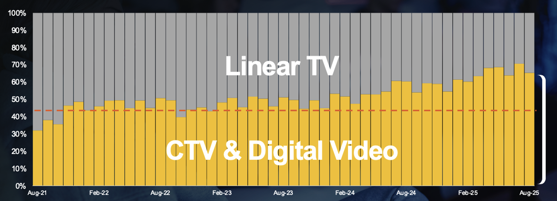 Comscore 追蹤美國 2021 年 8 月至 2025 年 8 月,電視與串流影音的觀看量,觀察初期,CTV + 數位影音的佔比約在 3-4 成間,期間雖佔比持續上升,但大概都不會超過 5 成太多,直到 2024 年 8 月起觀察到 CTV + 數位影音觀看量來到 6 成,並且在之後持續攀升。由這樣的趨勢我們可以看出來,CTV + 數位影音,已經從過去的「趨勢」,變為目前的市場主流。