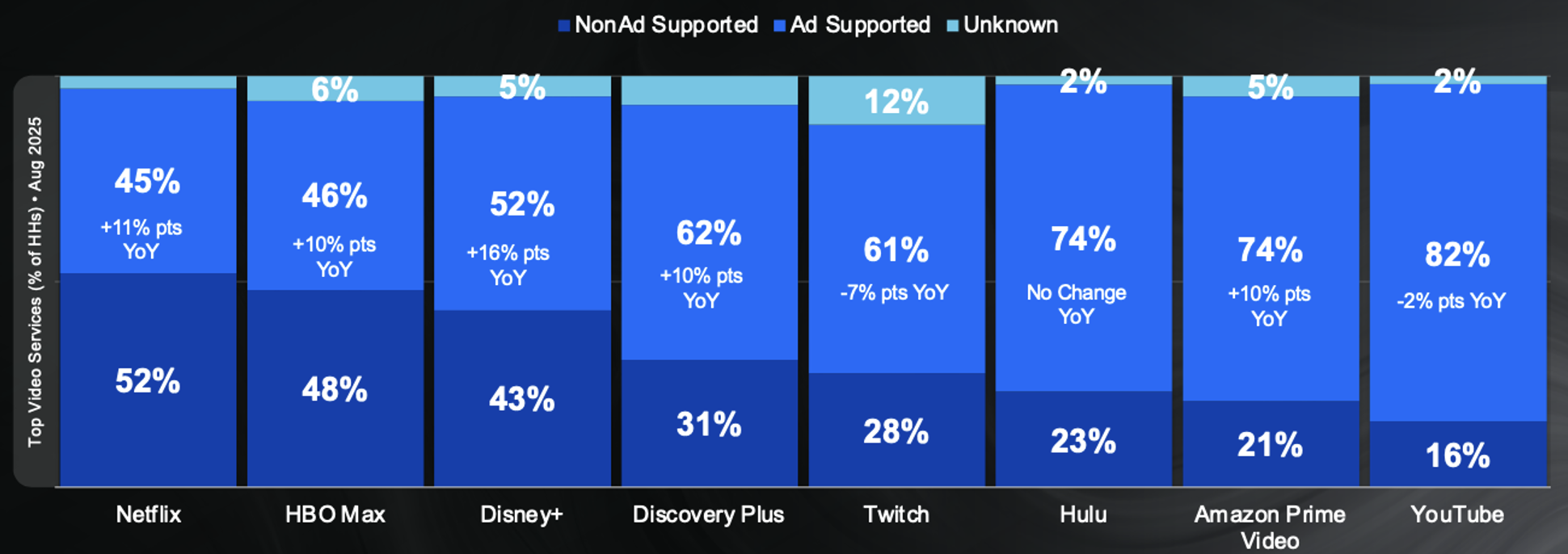 串流平台也推出折衷訂閱方案,讓消費者訂閱費降低,但必須觀看一定比例的廣告。從資料中我們可以看到,2024 到 2025 年間,許多串流平台的折衷方案都在採用家戶數上見到兩位數成長(Netflix +11%、HBO Max +10%、Disney+ +16%、Discovery Plus +10%、Amazon Prime Video +10%),而家戶數的成長也意味著整體的串流時長會跟著成長。