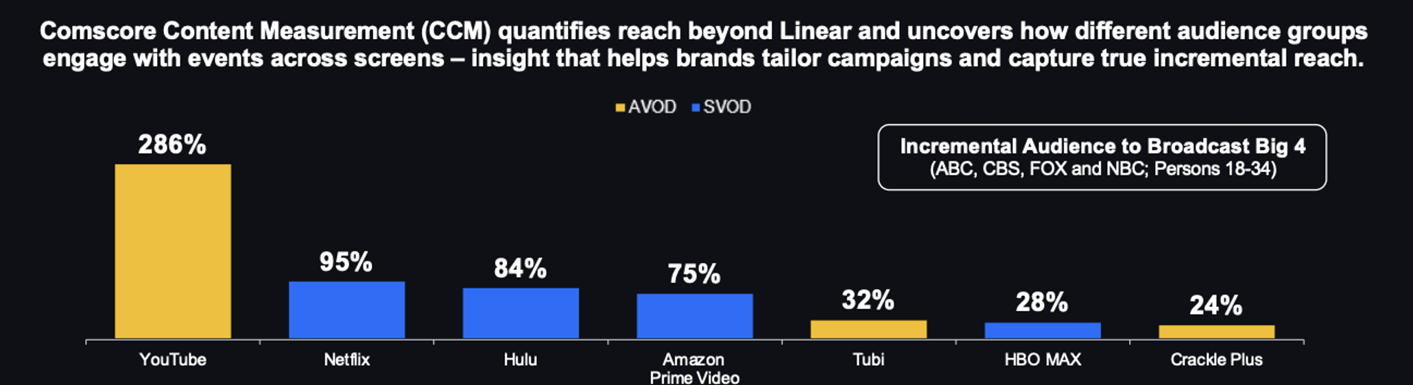 在美國,Comscore 同時測量了影音內容在 Linear TV 以及數位平台上的傳播效果,下圖以美國 18-34 歲民眾為例,若是把四大聯播網 (ABC, CBS, FOX, NBC) 視為基本盤,基本盤加上 YouTube 的總接觸效益會額外帶來 286% 的收視眾,基本盤加上 Netflix 則是可以額外增加 95% 收視眾。有些行銷人員認為,傳統電視與數位影音平台原本就應該有不同的操作策略,但也有些行銷人員認為跨螢幕的測量證明了媒體之間的互補效應,例如在電視相對弱勢地區可由數位廣告提高覆蓋率,或者是能避免預算重複投放,減少對單一平台的過度評估以及依賴。