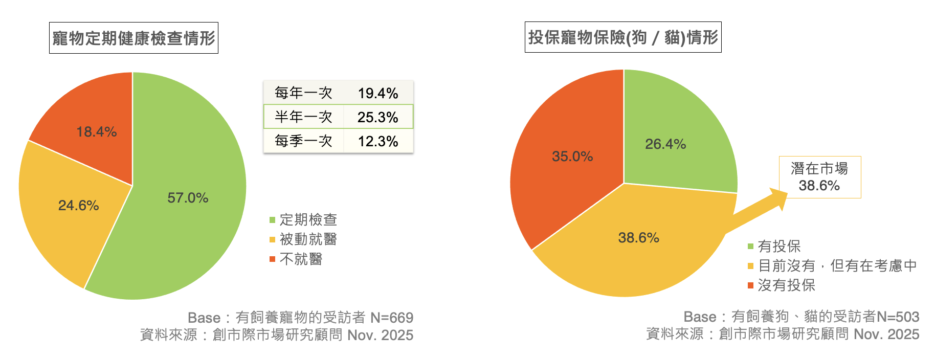 有飼養寵物者中,高達 57.0% 有為寵物做「定期檢查」的習慣,顯示多數飼主是願意投入時間與金錢維持寵物健康的,且檢查頻率以每半年一次 (25.3%) 的佔比最高。而在投保寵物保險方面,則有 26.4% 的貓狗飼主是「有投保」的;另一方面也有高達 38.6% 者為「目前沒有,但有在考慮中」的潛在客戶群。