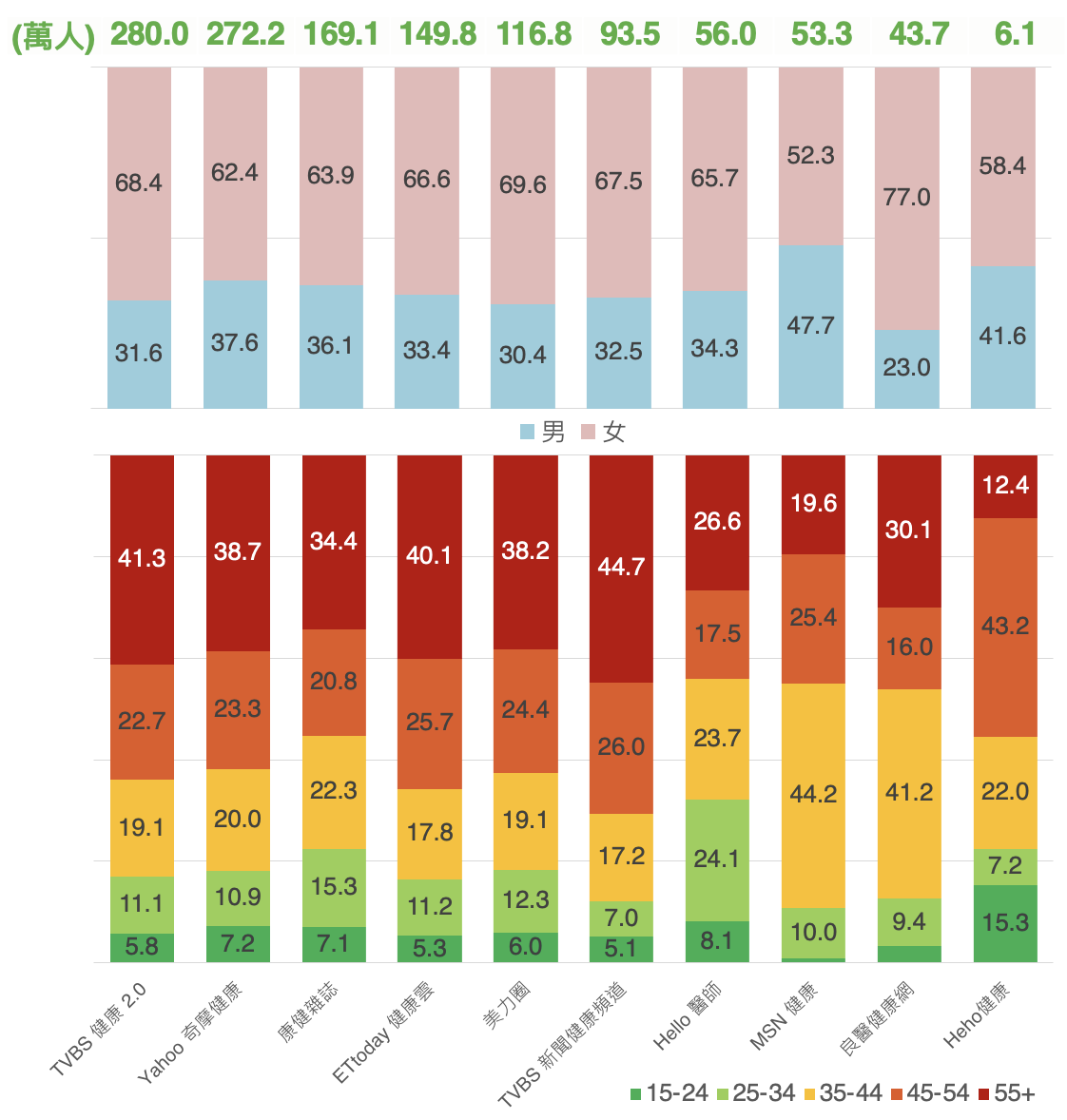 觀察 2026 年 1 月份,台灣健康資訊類網站造訪狀況,依人數排序前五為「TVBS 健康 2.0 (280萬)」、「奇摩健康 (272.2萬)」、「康健雜誌 (169.1萬)」、「ETtoday 健康雲 (149.1萬)」與「Women’s Health 美力圈 (116.8萬)」。以性別觀察,所有健康資訊類網站的女性網友佔比都高過男性。