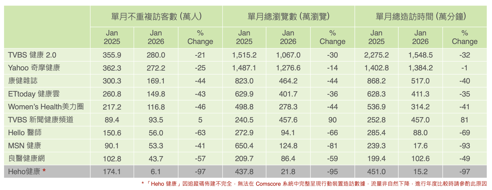 本期創市際雙週刊延續上一期的觀察,GenAI、AI Overview 這些零點擊搜尋對新聞媒體帶來影響,是否也同樣健康資訊類媒體上發生?我們做了 Jan 2025 與 Jan 2026 的年度比較,除了「TVBS 新聞健康頻道」在人數、瀏覽數、停留時間上都看到成長,其餘都是下降。人數上與去年同期相比下降 21% – 63% 不等,瀏覽數下降 14% – 81%,停留時間則是下降 1% – 93% 不等。內容型媒體流量受到 AI 衝擊已經是不爭的事實,那麼行銷人員是否能從社群媒體上得到更多資訊?
