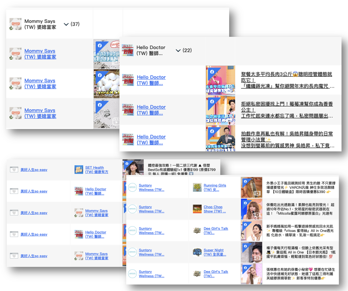 接著創市際透過 Comscore Social 提供另一個方式的觀察。Feb 2025 – Feb 2026 這13 個月以來「台灣電視節目」FB 粉絲頁上的數據表現,在 485 則牽手貼文 (Paid Partnership) 中,有 166 則屬於健康營養補給品,佔比超過三分之一。