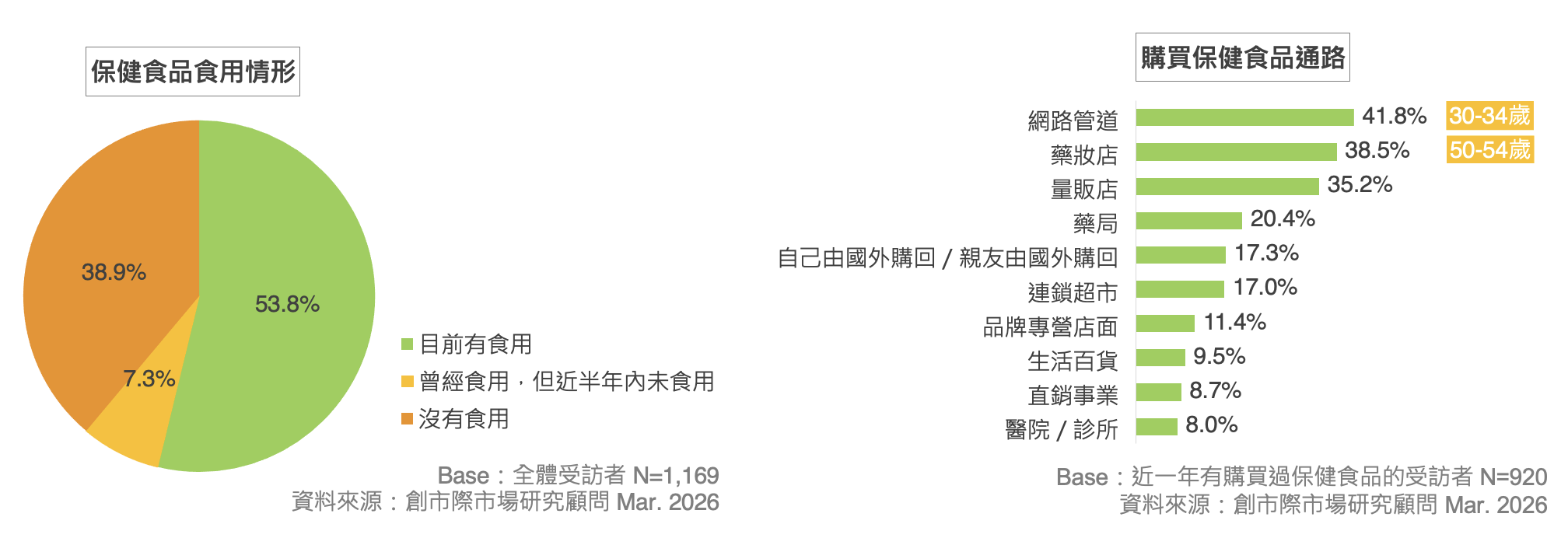 *購買保健食品管道 Top 3:「網路管道」(41.8%)、「藥妝店」(38.5%)、「量販店」(35.2%)