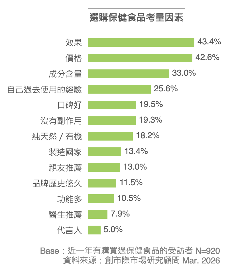 *選購保健食品考量因素 Top 3:「效果」(43.4%)、「價格」(42.6%)、「成分含量」(33.0%)