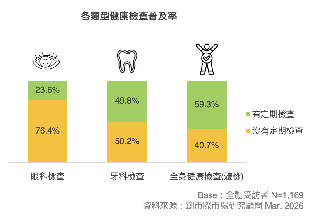 根據調查顯示,在各項類型的定期檢查中,以一般健康檢查(體檢)(59.3%)的普及率最高,其次是牙科檢查 (49.8%)。相較之下,有定期做眼科檢查(23.6%)的比例最低,超過七成民眾是沒有定期追蹤眼部健康的習慣。